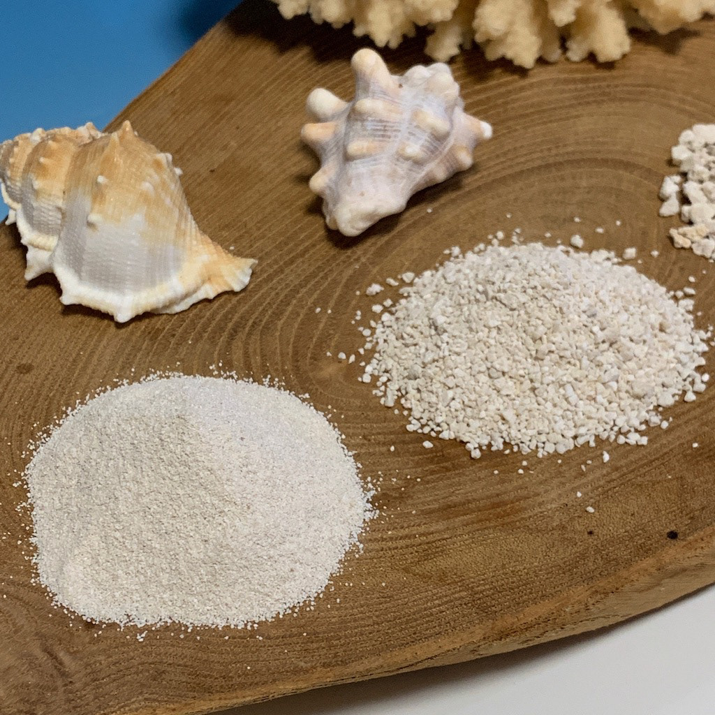 また、古い年代の石灰岩や海外産アラゴナイトサンドでは、魚の骨・ウニ類の棘・貝殻片などが混じっておりますが、与那国島原産化石サンゴは、ハードコーラル由来の純粋なアラゴナイトサンドとなります。